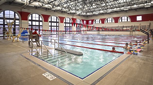 The outdoor leisure facility includes a zero depth entry, activity area, body slide and waterfall. There is a 275-square-foot indoor whirlpool and a 300-square-foot outdoor whirlpool with hydrotherapy jets and a waterfall.
