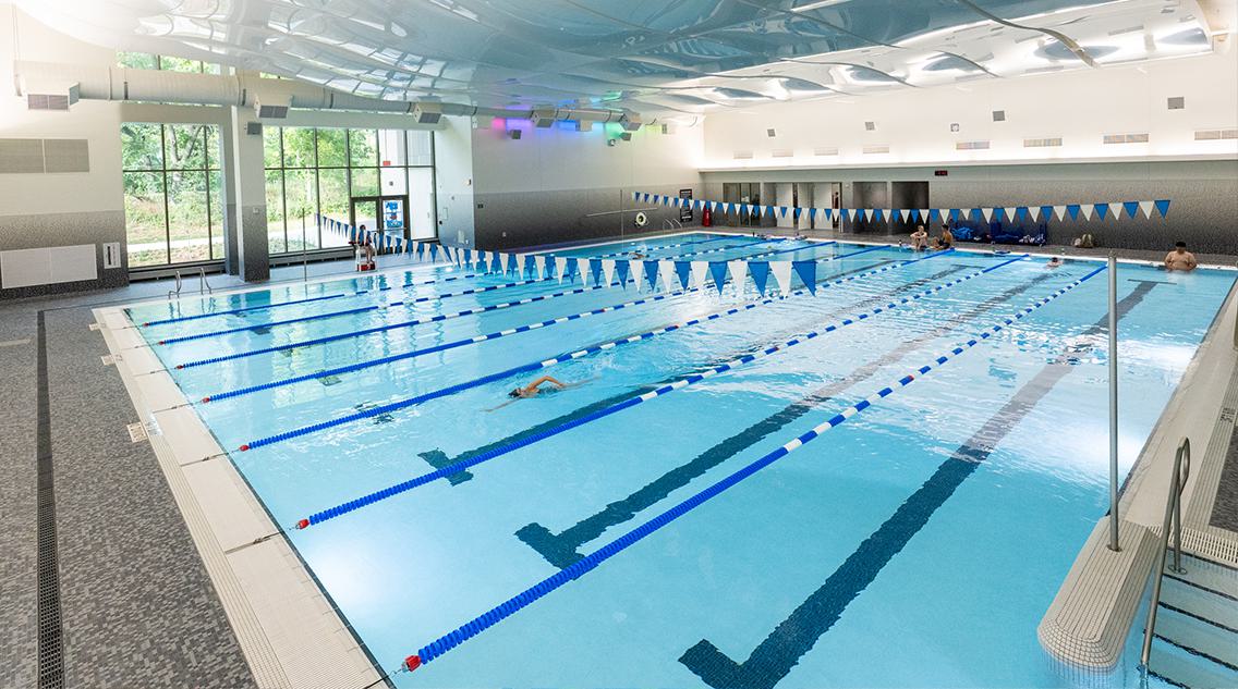 In addition to the natatorium, the center boasts a variety of fitness and recreation amenities including eight multipurpose courts, a Sub-Zero Ice Arena, a climbing and bouldering wall, sports simulators, multipurpose studios, an indoor jogging track, a rooftop fitness area, and over 29,000 square feet of fitness space, providing students, faculty, and staff with a vibrant and inclusive environment to pursue physical and mental well-being.