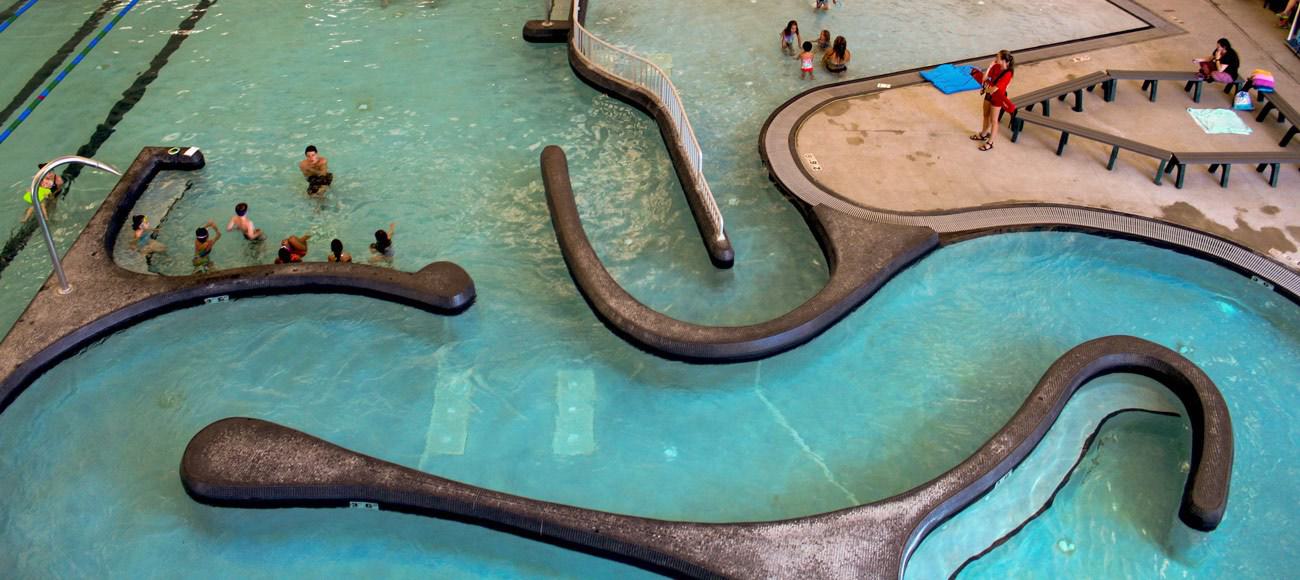 The family-friendly aquatic center features a zero-depth entry 4,877 SF leisure pool with a tot slide, geysers, a variety of sprays, and a large dumping feature suspended from the ceiling. Adjoining the tot play area is a winding current channel with spray features and vortex. Across from the tot play area is a three-story interactive run-out waterslide that plays a guest’s selected music from a touchscreen kiosk. Adjacent to the current channel is a 3-lane lap area that features a gracious ramped entry for users of all ages and abilities.