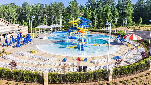 - 4,877 SF Leisure Pool, Runout Slide, 3-Lane Lap Pool, Current Channel with Water Rapids Zero-Depth Entry, Underwater Seating, Basketball Hoops, Variety of Sprays, Geysers, Jets, Dumping Feature