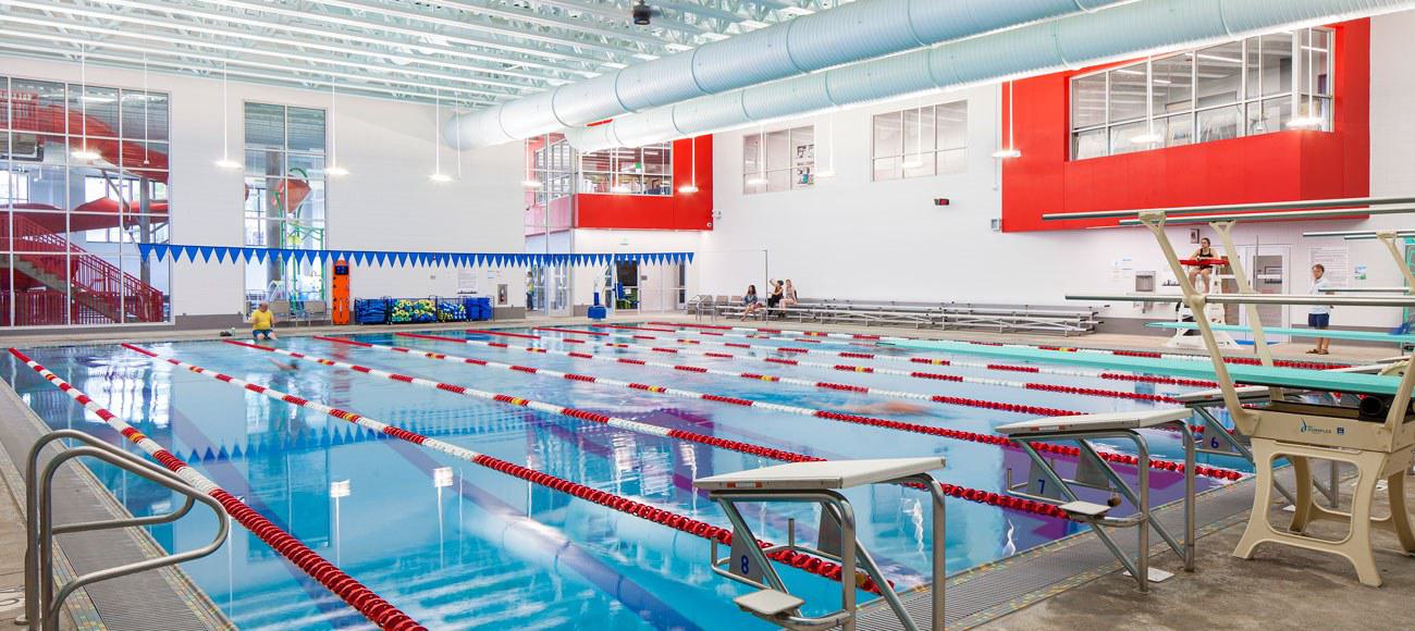 Families with children will be pleased with the 3,101 SF zero-depth entry leisure pool, complete with tot play structures, a dumping feature, geysers, decks sprays, and a large current channel that features exciting river rapids. Adjoining the current channel is a three-lane lap swimming space perfect for a warm-up, cool-down or learn –to-swim programs. Across from the lap area is a bright red run-out slide, a color that appears throughout the facility as an homage to councilwoman Madison’s hair color.