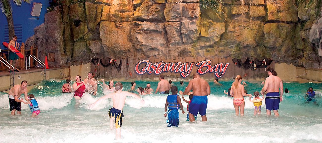 Guests can enjoy a variety of thrilling structures at the Castaway Bay. The 35-foot Master Blaster is an uphill water coaster that propels riders using water jets. The 100,000-gallon wave pool generates three-foot waves with a cascading waterfall that serves as a backdrop. An 80,000-gallon activity pool with interactive elements for pre-teen to adult water enthusiasts offers overhead nets, footbridges, floatables and treasure chests to walk over and maneuver around to test their agility and skill. A multi-story interactive play area with more than 100 different elements is topped with a 1,000-gallon dumping bucket that tips every two minutes. Two 50-person indoor and outdoor whirlpool spas can be relaxing hideaways for adults, while kids can have their fun on tandem slides, water pipes and not-so-scary sea creatures.