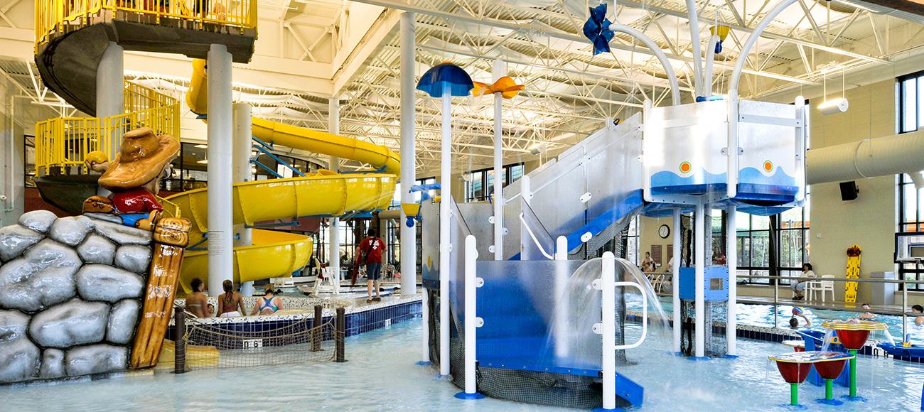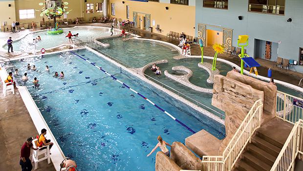 The aquatics area includes a leisure pool with multiple program zones. One zone is designated for recreation and program uses and also features a current flow channel with internal activities plus a waterslide and two whirlpools. The other zone is outdoors.