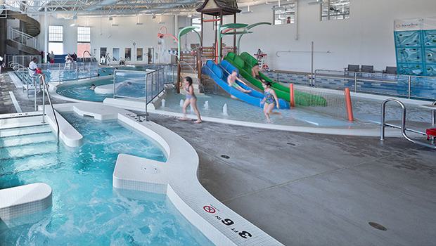 The Evansville Aquatic Center features one multi-purpose body of water, providing aquatic recreation, play, competition, and leisure. The zero-depth-entry splash and play area invites and promotes play for little ones and their parents or guardians. Deeper water connects this play area to the circular activity pool; basketball hoops anchor this space, and guests may find themselves competing here for hours. Open water provides endless opportunities for recreational play. The current channel offers aerobic programming opportunities such as resistance walking, as well as provides a space for guests looking to relax and leisurely float. The six-lane, 25-yard competition pool is ideal for lap swimming, swim practice, and meets. In addition to diving blocks, an aquatic climbing wall is also located in this space. Completing the aquatic offering is a waterslide tower, featuring two body slides terminating into runouts.