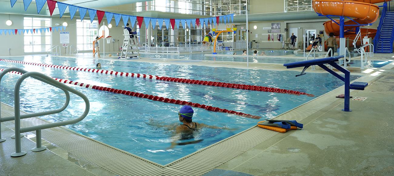 The new aquatics facility features a leisure pool, lap pool and whirlpool. The four-lane lap pool is designated primarily for lap swimming, while the leisure pool offers fun for all ages and swimming abilities. The zero depth entry area with interactive play features is ideal for young children, while the slide offers excitement for those looking for more of a thrill. For users seeking relaxation and socialization, the whirlpool is the place to be.