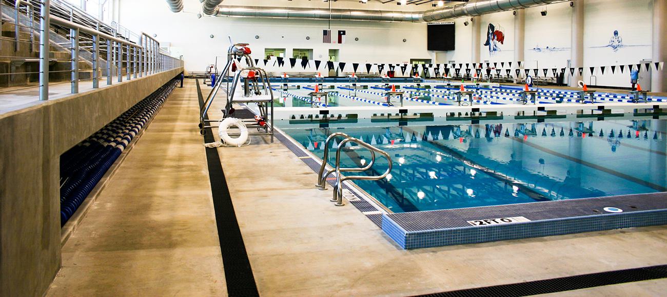 The 38,000-square-foot natatorium features a 50-meter-by-25-yard, Olympic-sized pool with eight lanes, two moveable bulkheads, two 1-meter diving boards and one 3-meter diving board. The pool was carefully engineered to provide the fastest possible competitive environment, and the bleachers were carefully designed to separate spectators and competitors. Large windows located high on the north-facing wall provide soft, natural light, minimizing glare on the pool water.