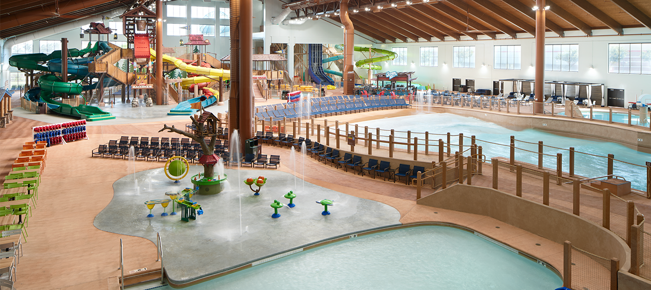 The 29-acre location features a whopping 95,000 SF indoor waterpark that is open 365 days a year with several family-friendly attractions. The little ones will have a blast in the Cub Paw Pool™, a turtle and frog-themed splash pad while older children will enjoy the thrills of Fort Mckenzie™, a water fort tree house with slides and toys. The whole family will enjoy thrilling open flume slides at Totem Towers™, and the drop slide at Wolf Trail™. The tube slides at Rapid Racer™ and Sequioa Splash™ have speed, twists, and turns, ensuring smiles and laughs throughout the ride. Family fun can be found at Big Foot Pass, where family can challenge each other to cross the floating lily pads, at Chinook Cove™ and Raccoon Lounge™ where there are many interactive activities like water basketball. Relaxation can be found at Crooked Creek™ on a leisurely ride on the river. The resort also features a 45,000 SF entertainment complex.