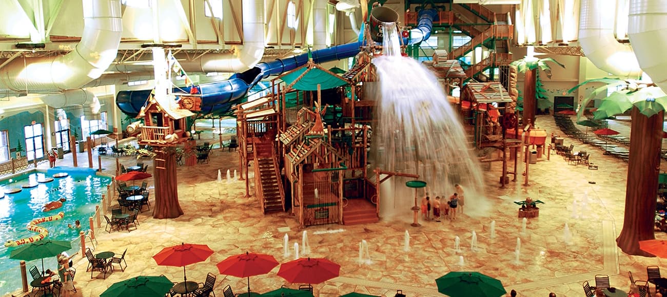 - Amenities: Indoor: 470 LF lazy river/plunge, 7,441-square-foot wave pool, 3,890-square-foot activity pool, 381-square-foot upper whirlpool, 425-square-foot lower whirlpool, 4,055-square-foot children’s activity pool, 6,775-square-foot Fort Mackenzie™ area: a 4-story interactive tree fort, Various themed iconic slides, Cabanas