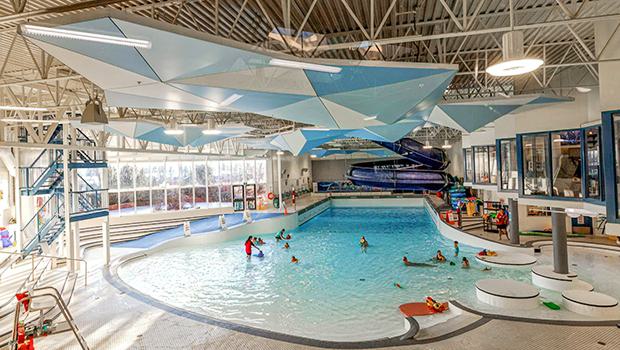 The 50-meter competition pool is suitable for lap swimming, swimming lessons, diving, and open water for leisurely swim. Exert some energy by playing water basketball, battling the vortex pool, taking a ride down the thrilling body slide with extreme height and speed or relax down the meandering lazy river and cool off through the spray channel. The kiddos will love the play structure, spray features and the spray zone found in the zero-depth family pool. Adventure awaits for locals and visitors alike, with additional unique amenities such as the floating wiggle bridge water walk and the climbing wall.
