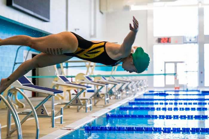 The Lovington Community Wellness Center’s aquatics are designed with fitness in mind and the 6,260 SF Myrtha pool is built for longevity and various levels of competition, with the eleven lane 25-yard course, or the nine lane 25-meter configuration. The pool is equipped with a video scoreboard with instant playback features, ideal for hosting swim meets or for swimmers reviewing their form. This competition pool has features for a variety of programming options including a climbing wall, two basketball hoops, two 1-meter diving boards, water polo nets for team sports, and even a Wibit WiggleBridge. Nearby is the warm water 520 SF therapy pool, designed for individual aquatic therapy and small group wellness activities.