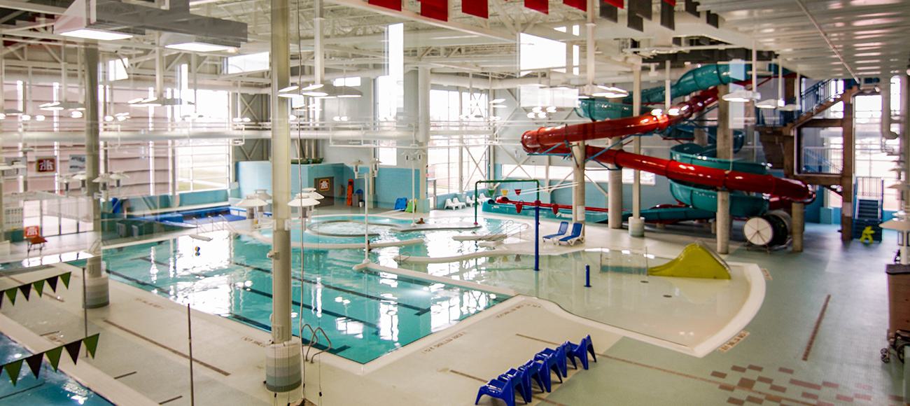 - 4,165-square-foot indoor leisure pool: Zero depth entry, Tot slide, Trio dumping buckets, Geysers, Current channel, 3 leisure lap lanes, Hydrotherapy bench, 2 body slides with runout