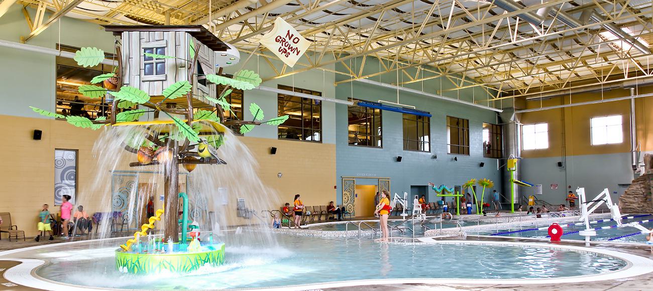 WTI was hired as the consultant for the programming, design and engineering of the aquatics area. Through multiple programming, theming and public meetings, WTI developed a design sure to rival any nearby indoor aquatics facilities. The 'Day in the Park'-themed aquatics area features oversized caterpillars, water-spraying sunflowers, waterfalls and rock climbing. The organically shaped pool is designed to provide a wide range of activities for all ages, and offers multiple programs, like water aerobics, learn-to-swim programs and therapy. The current channel offers a wide range of interactive elements, including water sprays, a vortex, dumping buckets and TNT detonators located on the deck that trigger bursts of air under the water. The 25-yard, four-lane lap and wellness pool features a slide tower that doubles as a rock climbing wall and jumping platform––perfect for the more adventurous swimmer. Thoughtful design was employed throughout this facility, as shown in multi-purpose features like the slide tower, climbing wall and jumping platform that are all built into one element. The indoor/outdoor run-out slide saves space and helps to increase excitement for the facility by using outdoor real estate for the slide flume that starts inside, runs outside and ends inside.